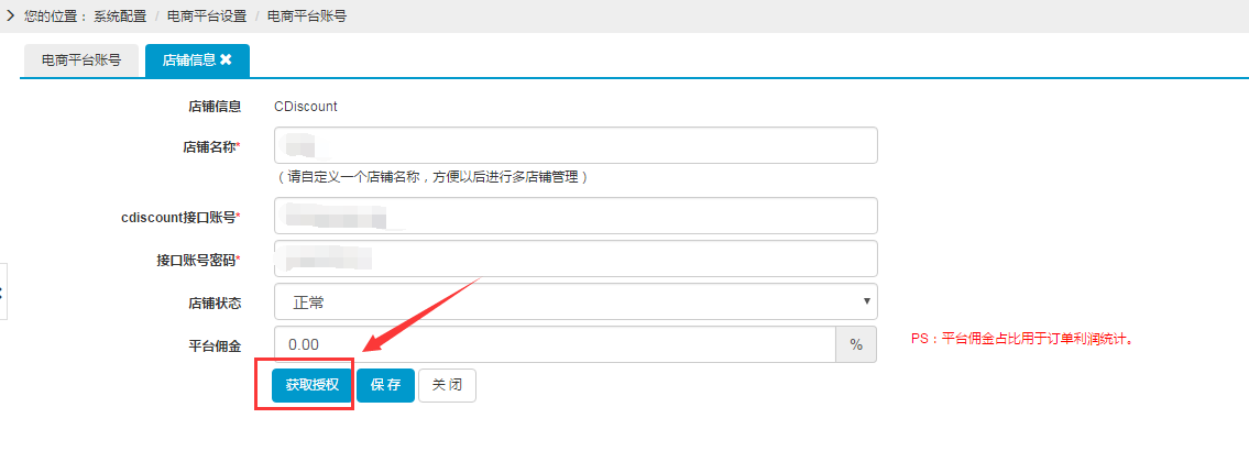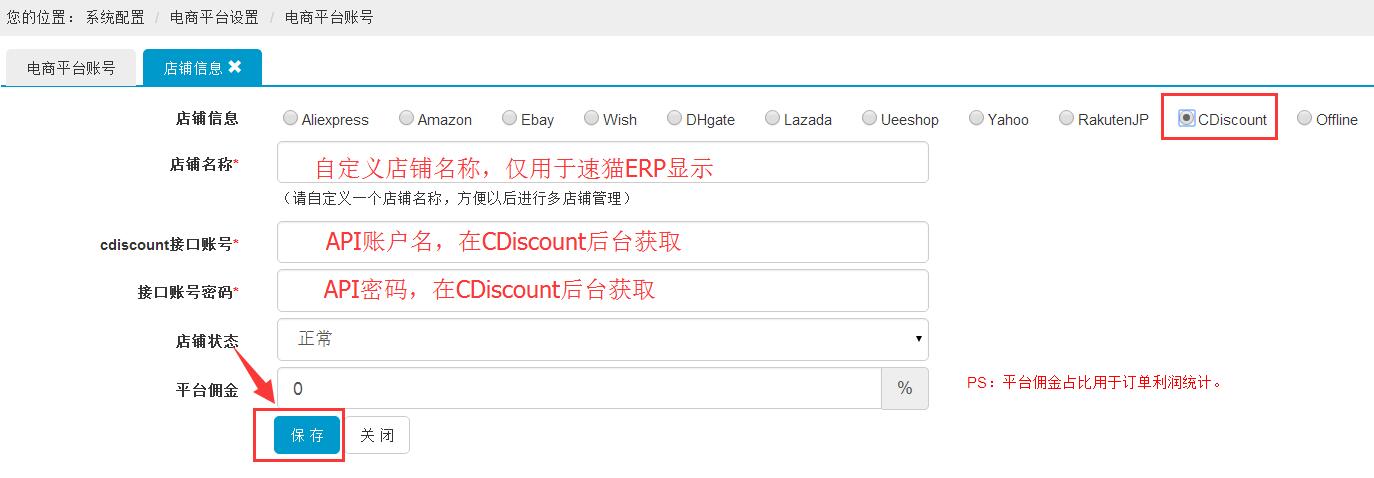 第一步:选择CDiscount平台,填写店铺名称、填写CDiscount接口账号(API账户名)、接口账号密码(API密码),最后点击【保存】