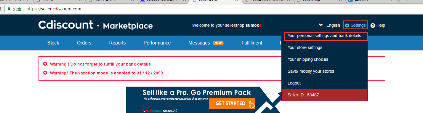 输入店铺的账号、密码,进入CDiscount后台,点击Setting�Your personal setting and bank details,如下图: