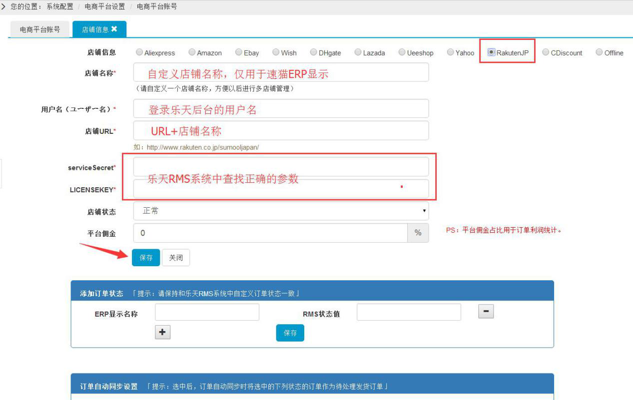 第三步:为确保日本乐天RMS系统中订单状态与速猫保持一致,需要添加订单状态,匹配ERP显示名称与RMS状态值