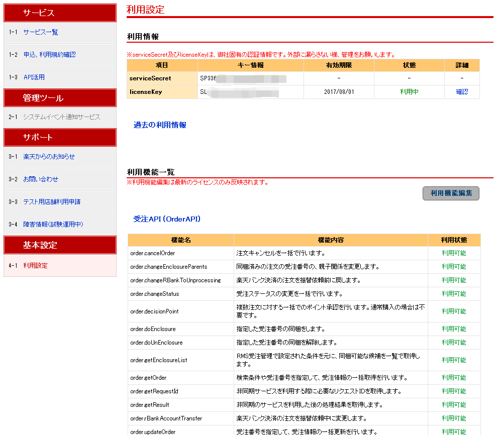 在乐天RMS系统中查找正确的ServiceSecret和LicenseKey密钥,复制并填写到对应的位置