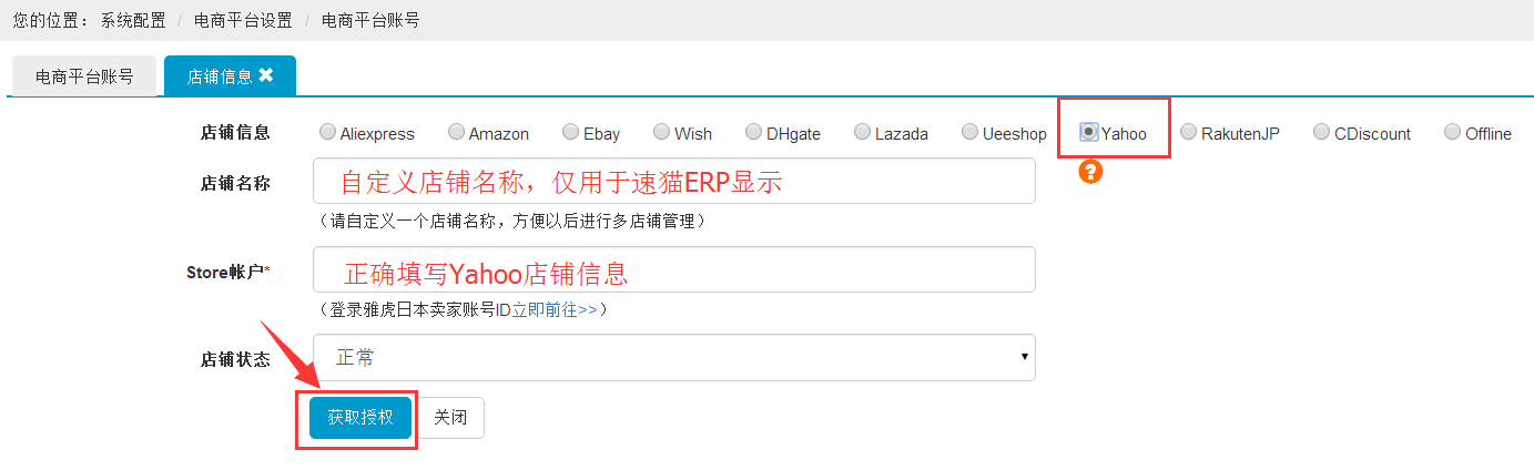 第二步:选择Yahoo平台,填写店铺名称、Store账户,最后点击【获取授权】,完成授权。